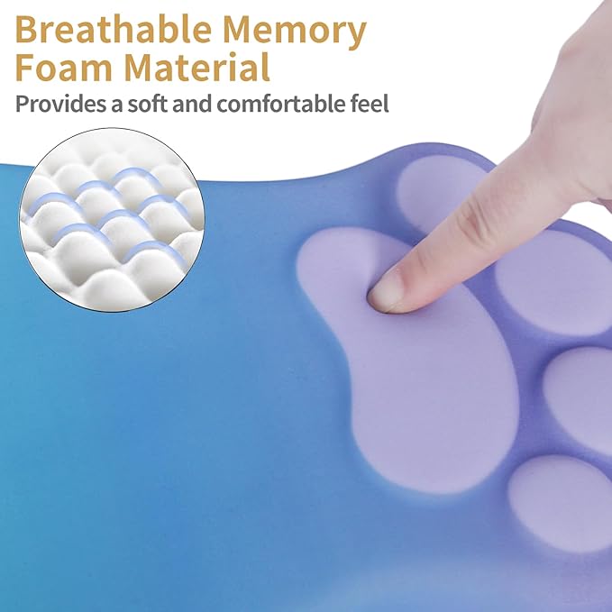 - 【Ergonomic Cat Paw Massage Design】The combination of cat paw inspiration and ergonomics.Cute gradient purple green ergonomic mouse pad has a 9-degree slope ensures proper wrist alignment and massage bump design perfectly support the wrist and palm,effectively relieve wrist pain and fatigue, improve carpal tunnel syndrome (CTS).This innovative design offers superior comfort,reducing pressure and preventing carpal tunnel pain.It's your best choice of desk mouse pads.