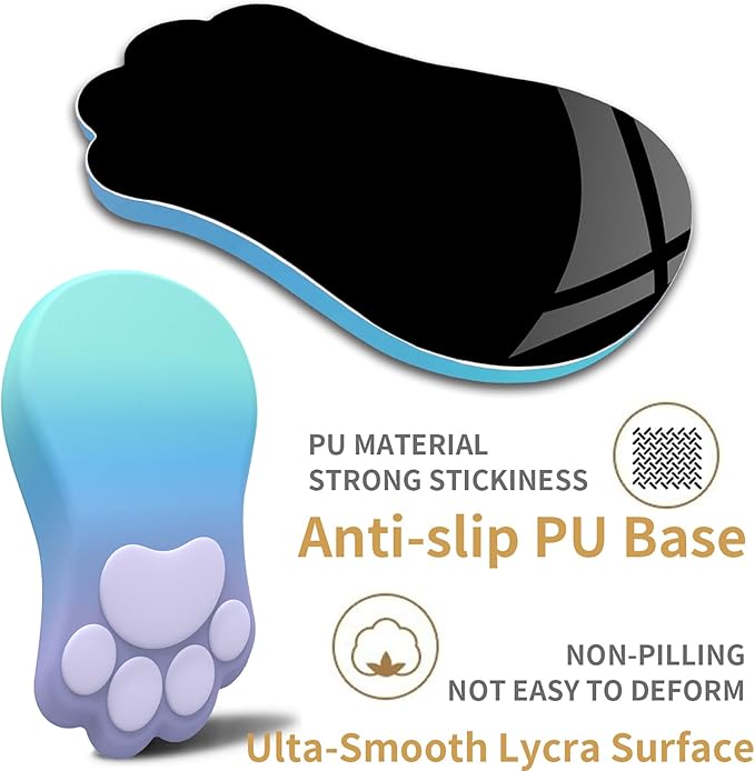 - 【Non-Slip PU Base】Gradient green cat paw ergonomic mouse pad with wrist rest and keyboard wrist rest feature a anti-slip PU base can grasp firmly in place on any surface, preventing slipping or sliding during use.The anti-slip bottom ensures the mouse pad with wrist rest remains stable,whether you're working on a desk, bed, or couch,the pad stays firmly in place