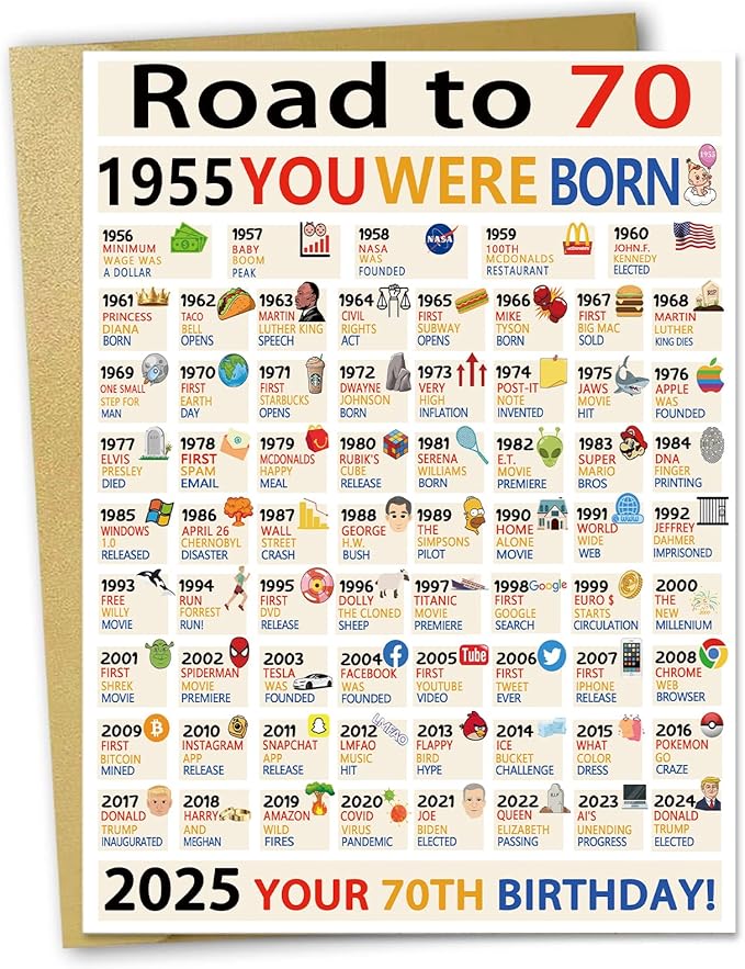 - Memorable Gift: Road to 1955 birthday card contains interesting events that happened every year, would be a memorable gift for anyone who turns 70 in 2025.