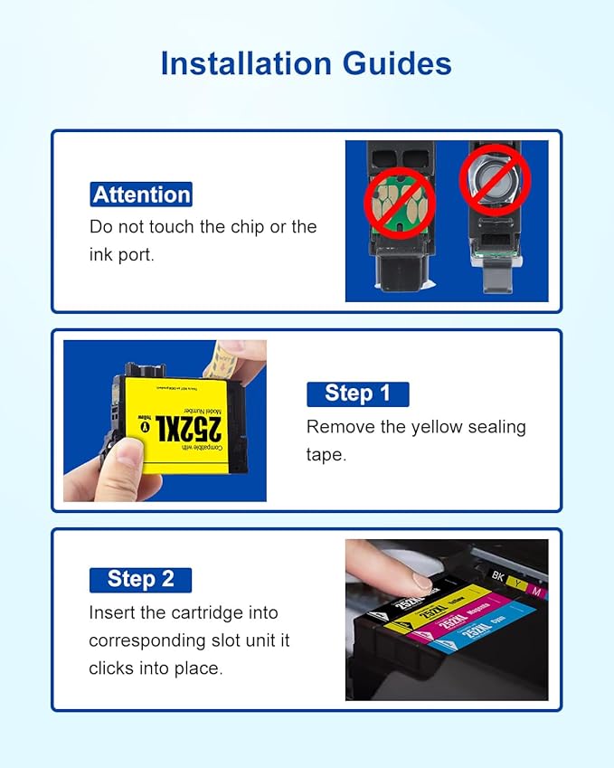 - Installation guide: Step 1 : Remove the yellow sealing tape. Step 2 : Insert the cartridge into the correct slot until it clicks into place. (Note: Do not touch the chip and the nozzle)