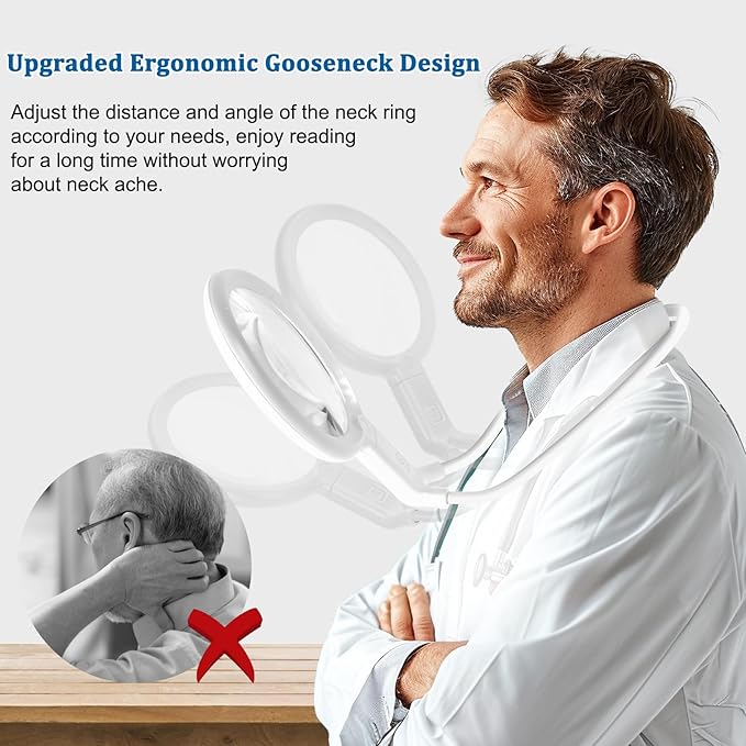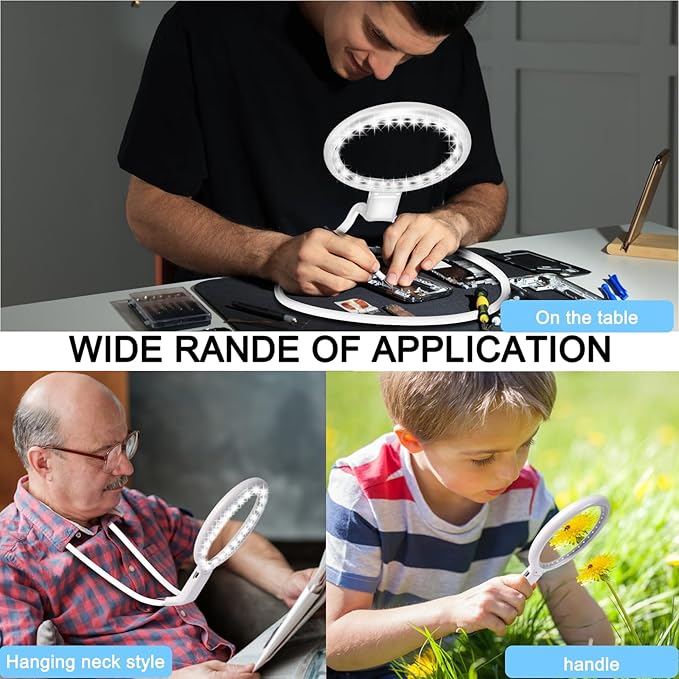 - 3-in-1 Magnifying Glass: This magnifier offers three versatile usage option, magnifying glass around neck, placed on the table and detech gooseneck to make it handheld, it can meet your needs in daily life and work. It will be a good choice of auxiliary tools