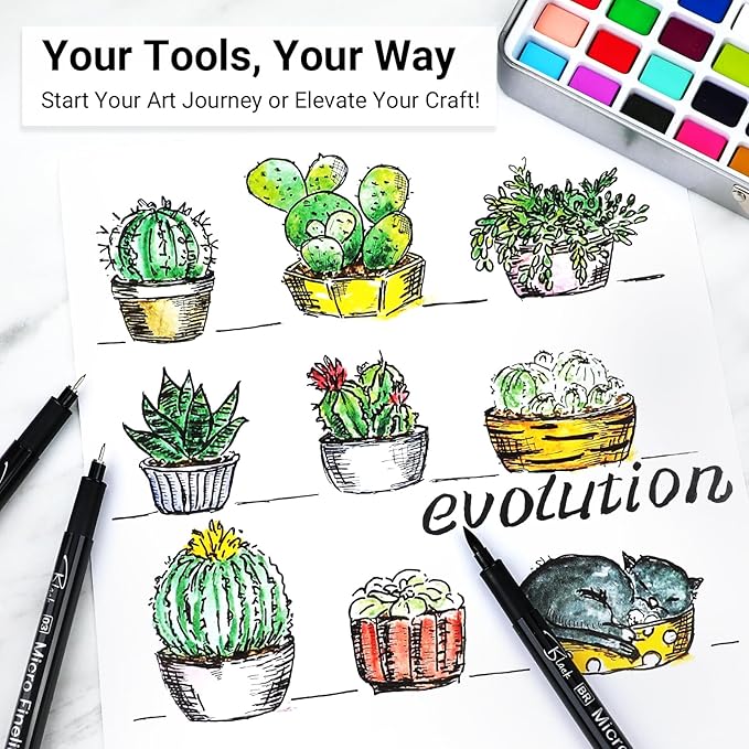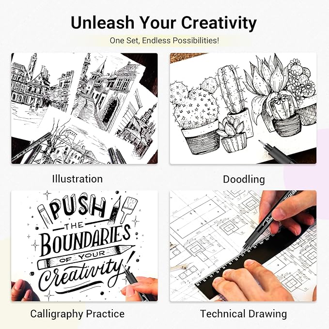 - For Mixed-Media Art: Designed for smooth writing and drawing, these inking technical pens work perfectly on sketchbooks, planners, watercolor backgrounds, vellum, and mixed-media paper. Compatible with watercolors, highlighters, alcohol markers, and pencils for mixed-media art. Ideal for journaling, bullet planners, comic illustrations, and professional artwork