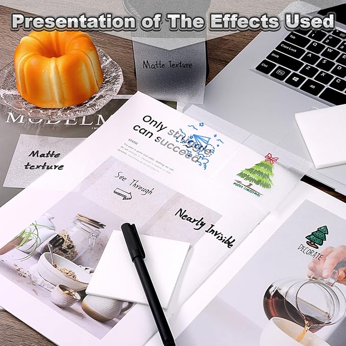 - Glass-like Frosted Glitter: The sticky notes is crafted from a high-transparency frosted material, providing a glass-like clarity when applied to books. It features a frosted finish that ensures smooth writing. Moreover, its subtle shimmer enhances the visibility of reading, note-taking, and memo-writing, while adding a distinctive aesthetic charm.