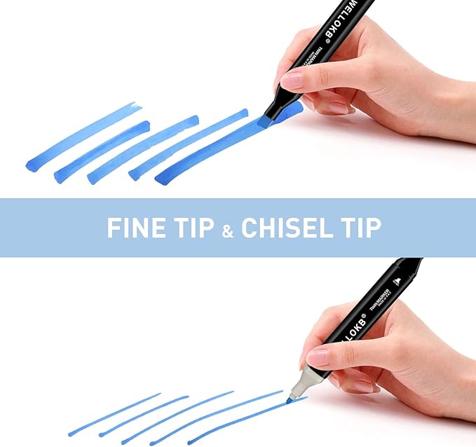 - Dual Tip Markers: WELLOKB alcohol based markers feature a Fine tip (0.5-2 mm) and a Broad tip (2-7 mm) for both detailed strokes and bold coloring. Ideal for sketching, drawing, and adult coloring books, they offer excellent versatility and smooth blending.