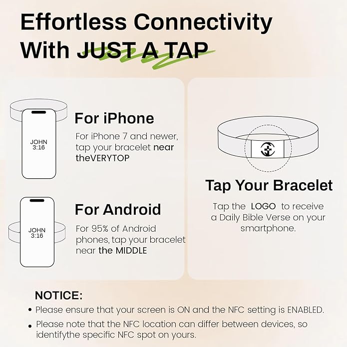 - Note: Bible scripture bracelet does not require an app to be installed, please make sure your screen is on and the NFC settings are enabled please, note that the NFC location may vary from device to device, so please determine the exact NFC location on your device, if you have any questions about the christian bracelet or after-sales service, please contact us on Amazon. We will reply and give you a satisfactory solution within 24 hours