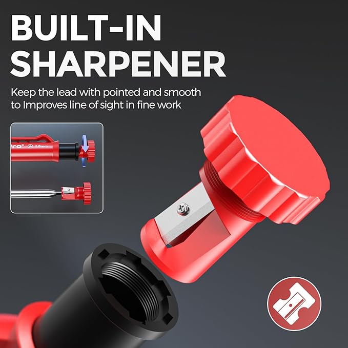 - Carpenter Pencils with Sharpener: The sharpener is screwed into the top of the work pencil, which won't get lost either. Built-in pencil sharpener that keep the lead with pointed and smooth to Improves line of sight in fine work