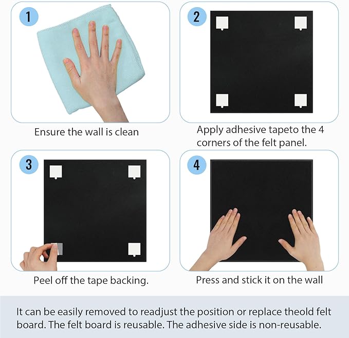 - SAFE ADHESION & WALL FRIENDLY: The pin board comes with removable adhesive sticker, no nails required, easy and strong installation, removable and repositionable, flexible to use, Note: Please use the felt tile boards on smooth surfaces, avoid using them on peeling, dusty or uneven surfaces. Adhesive can be removed using a hot hair dryer.