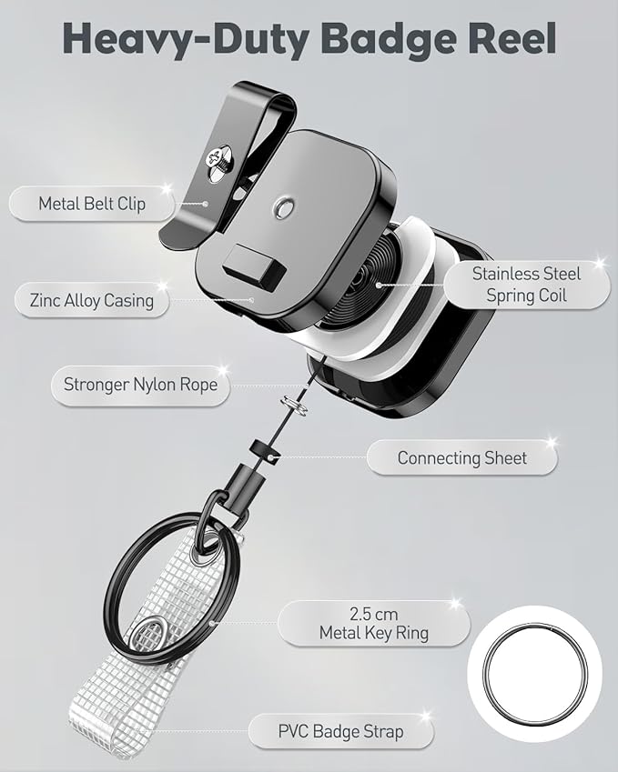 - Retractable Badge Reel: Reliable built-in stainless steel spring coils with strong retraction force. Ideally endure pulls over 10,000 times and hold up to 3 oz without falling