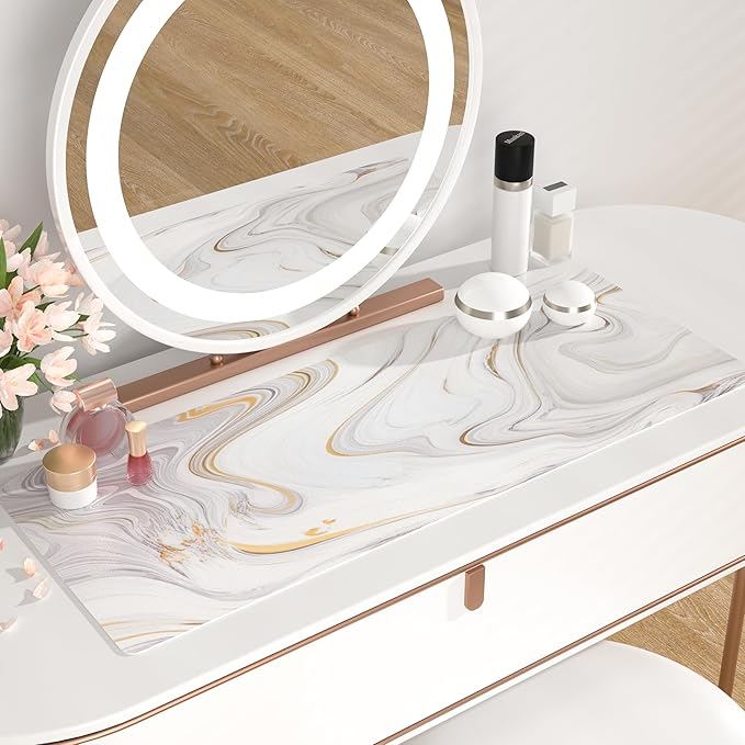 QIYI White Mouse Pad, Cute Marble Large Desk Mat, PU Leather Desk Protector Mousepad, Gold Grey Striped Waterproof Computer Keyboard Gaming Mouse Pads, Non Slip Extended Writing Pad 31.5" x 11.8"